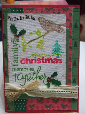 This Christmas card is made by stamping images on a white piece of canvas which is really easy to do - ink & stamp. However you need to let the ink dry completely before adhering to cardstock paper. Mine has smudge marks and resulted in a vintage looking card and that's the way I like it :) A quick and easy card to make and looks great, too, as the stamped images on canvas look like cross stitched.